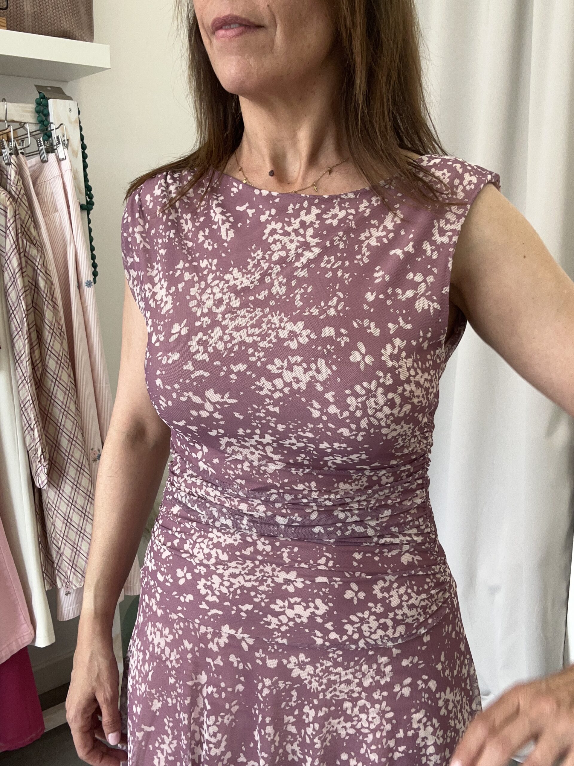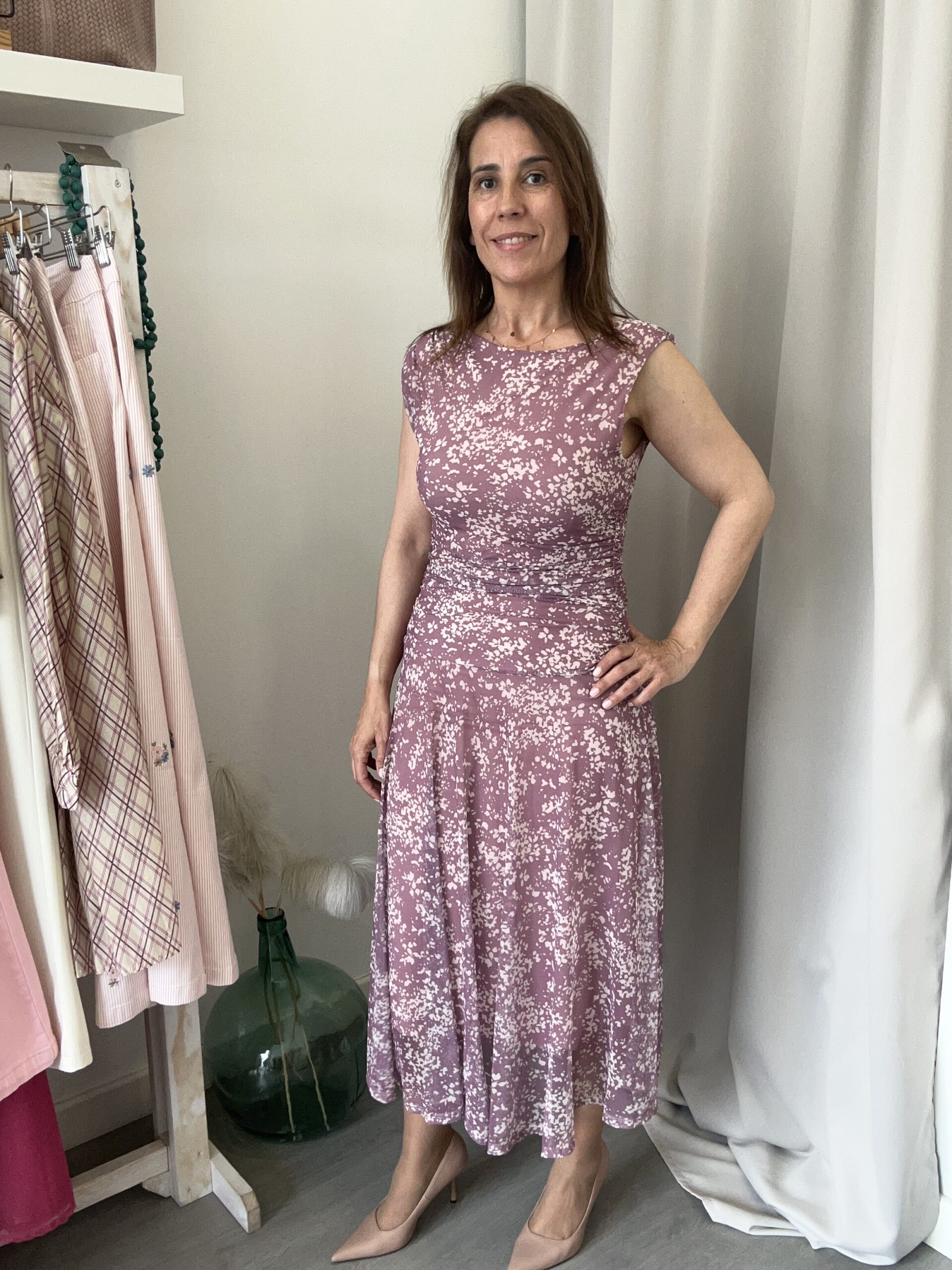 Vestido MIDI de manga sisa y cuello asimétrico. Fruncido en la parte del tronco. Queda ajustado. Forro interior. Tejido efecto gasa. Talla única (desde la 36 hasta la 42). Disponible también en rosa