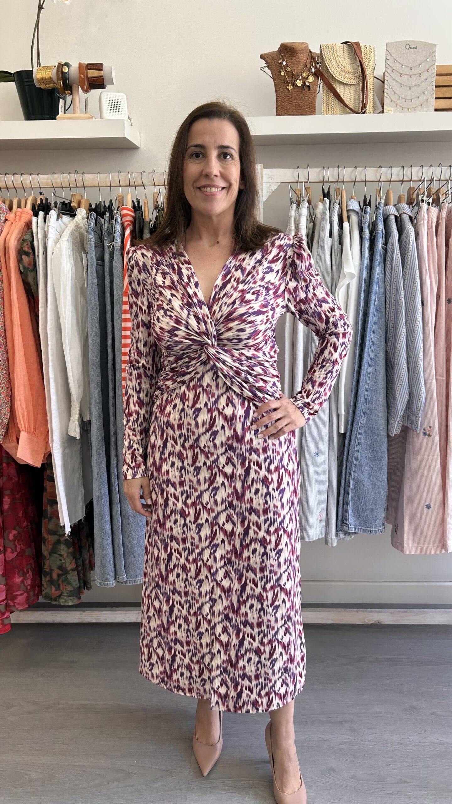 Vestido de manga larga y escote en pico con nudo en la parte del pecho. Lleva hombreras. Tejido en seda fría. Queda ajustado. Abertura en la parte delantera de la falda. Disponible también en azul