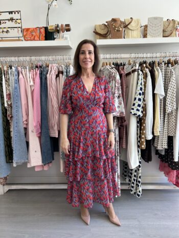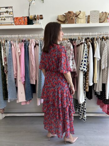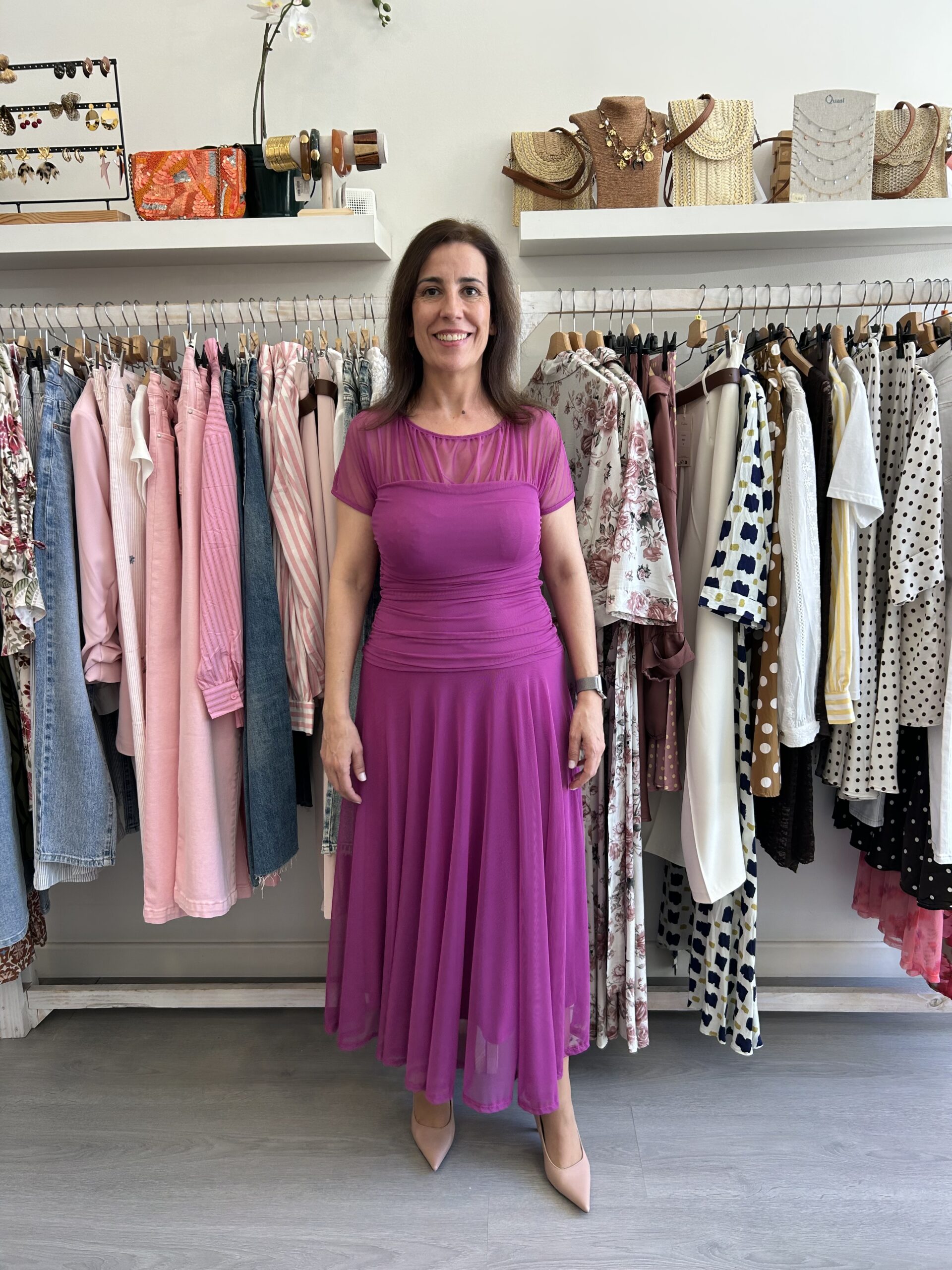 Vestido largo y manga corta con cuello redondo y gasa transparente en la parte superior del pecho. Fruncido en la cintura y falda un poco mas larga en el frente y más corta en los lados. Forro interior. Disponible también en Fucsia