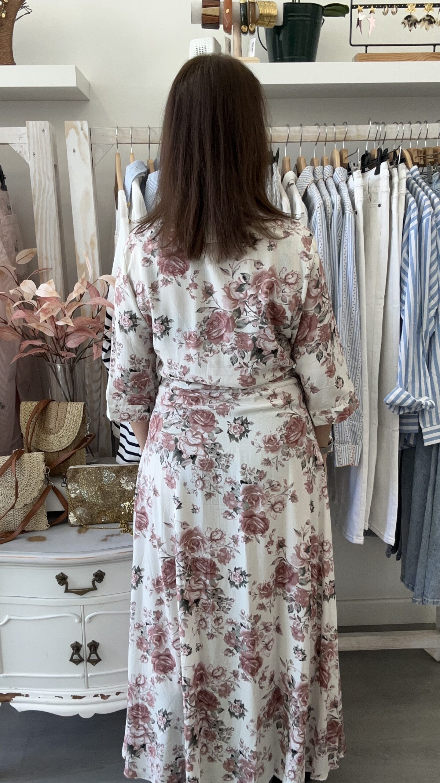 Vestido largo de manga al codo. Estampado floral en rosa sobre fondo crudo. Detalle de topitos en plata en el fondo de la tela. Cinturón en el mismo tejido del vestido y cierre frontal con botones. Disponible también en azul