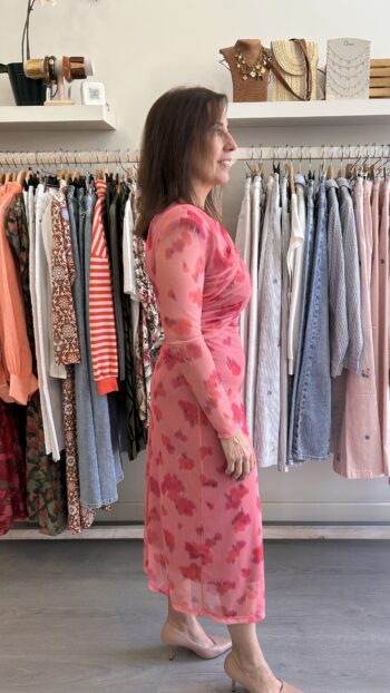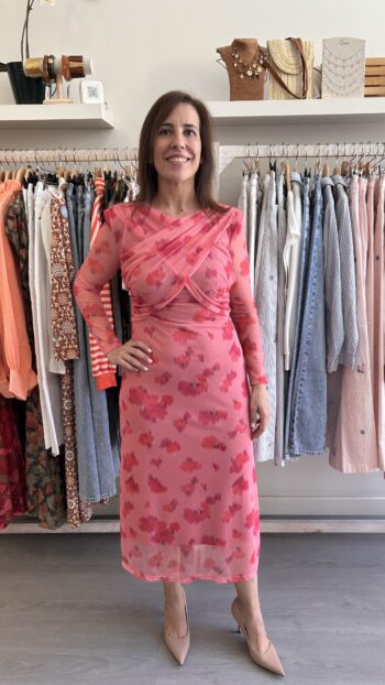 Vestido de manga larga y escote en pico. Tejido en seda fría. Nudo en la parte delantera. Abertura en la parte delantera de la falda. Corte recto. Queda ajustado. Talla única (desde la 36 hasta la 40). Disponible también gris azulado