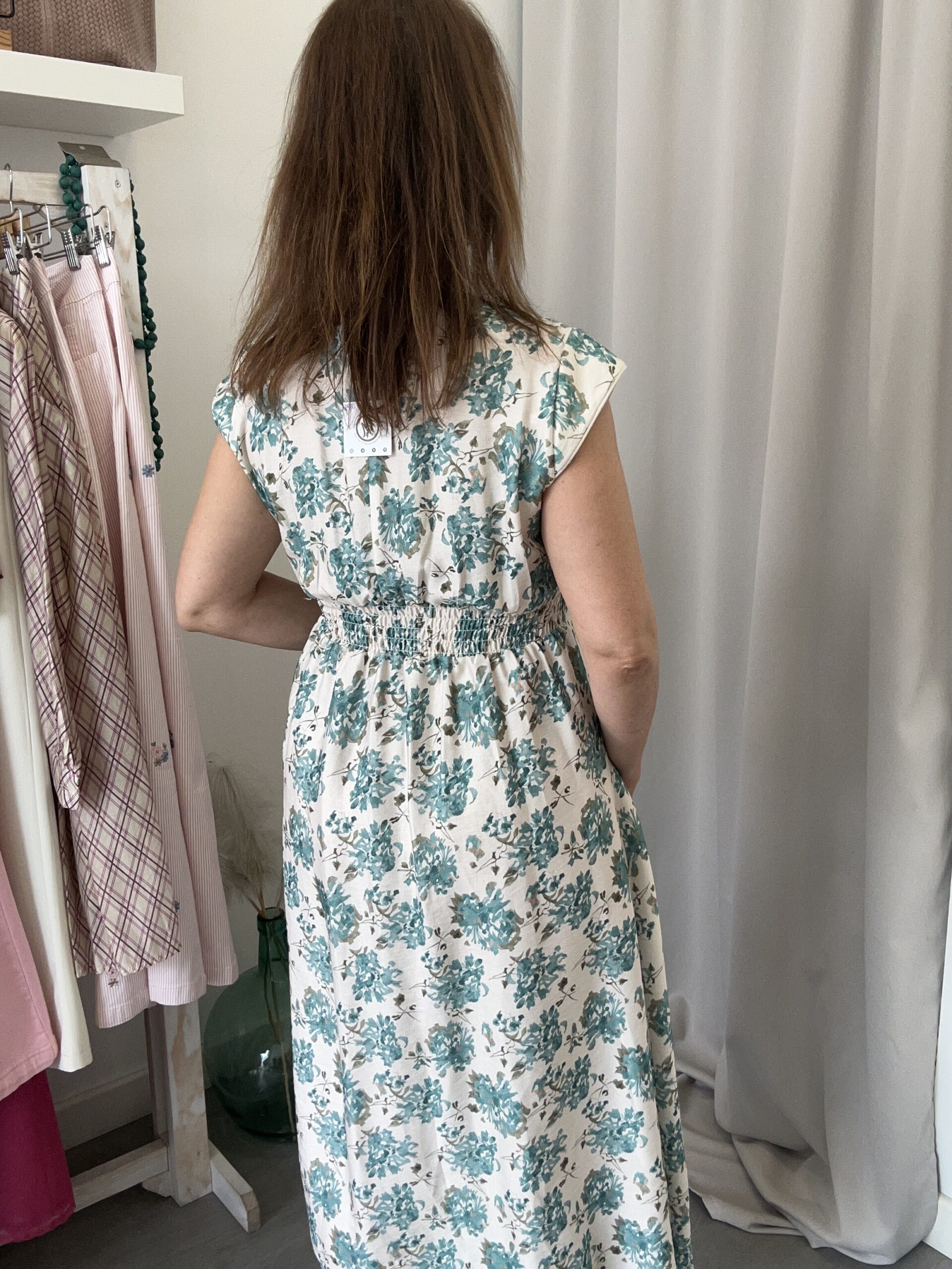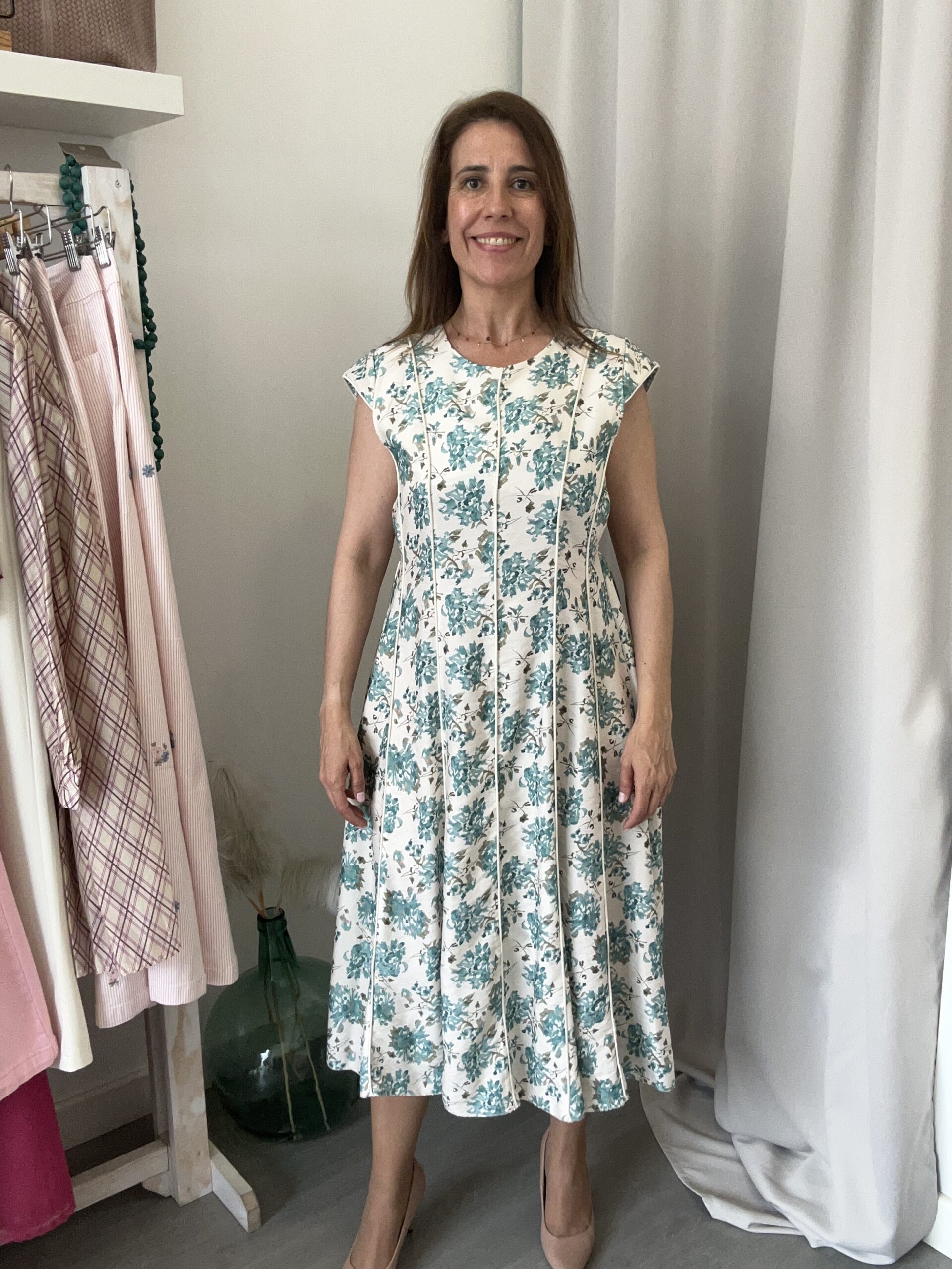 Vestido MIDI de manga corta y cuello caja. Corte evasé y costuras tipo princesa. Talla única (desde la 36 hasta la 40). Disponible también en Rosa