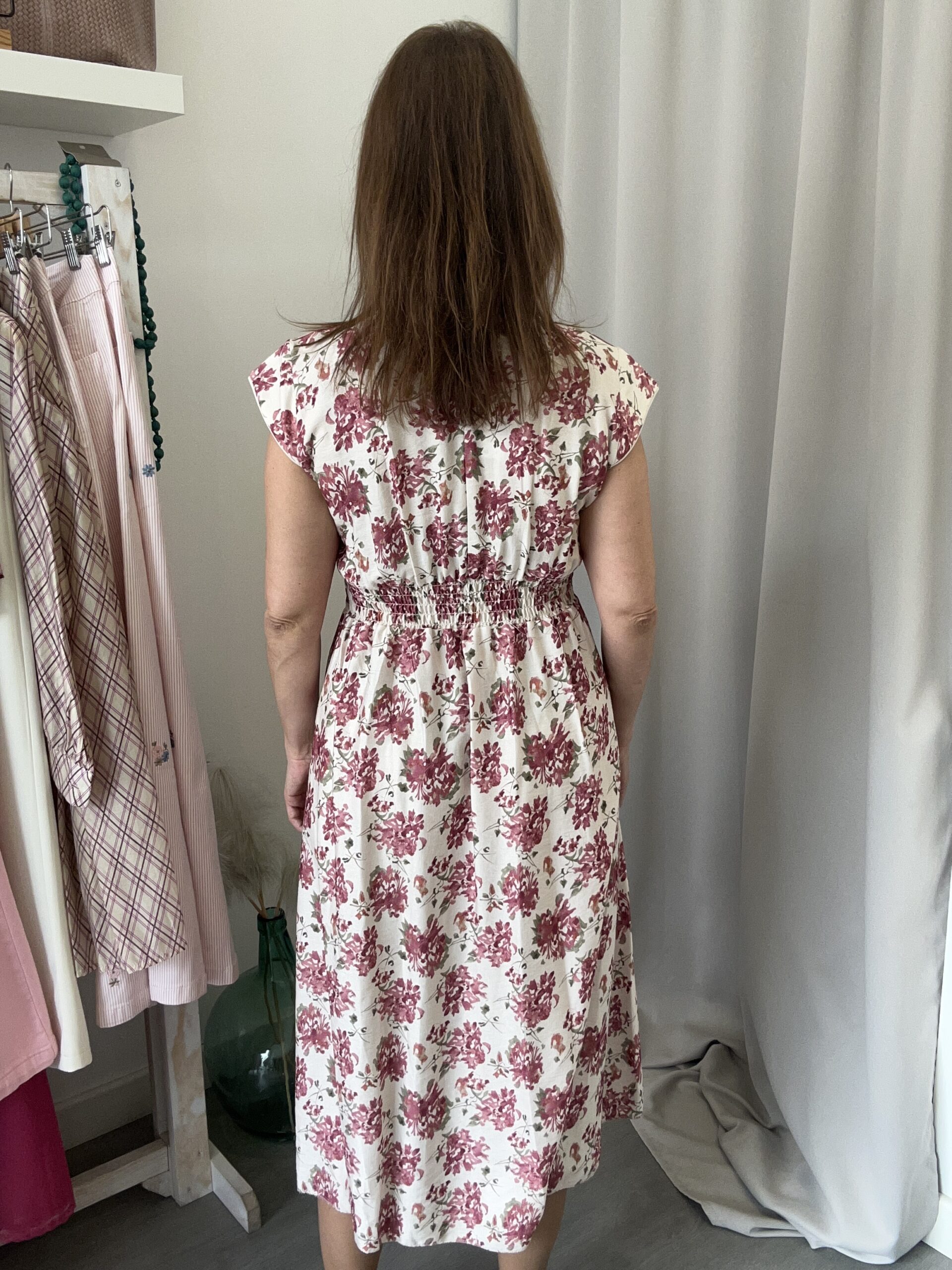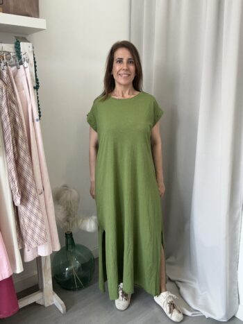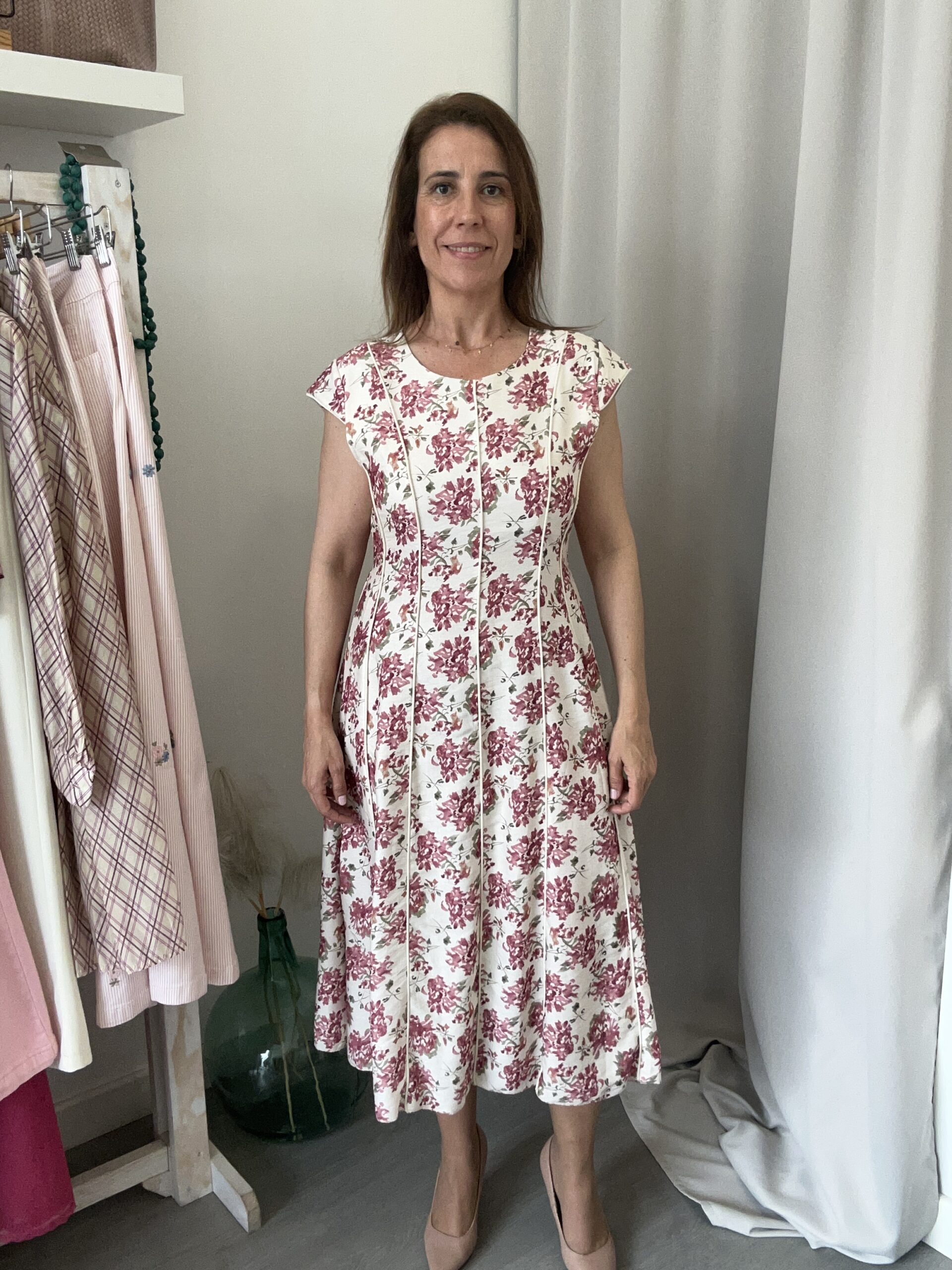Vestido MIDI de manga corta y cuello caja. Corte evasé y costuras tipo princesa. Talla única (desde la 36 hasta la 40). Disponible también en Azul