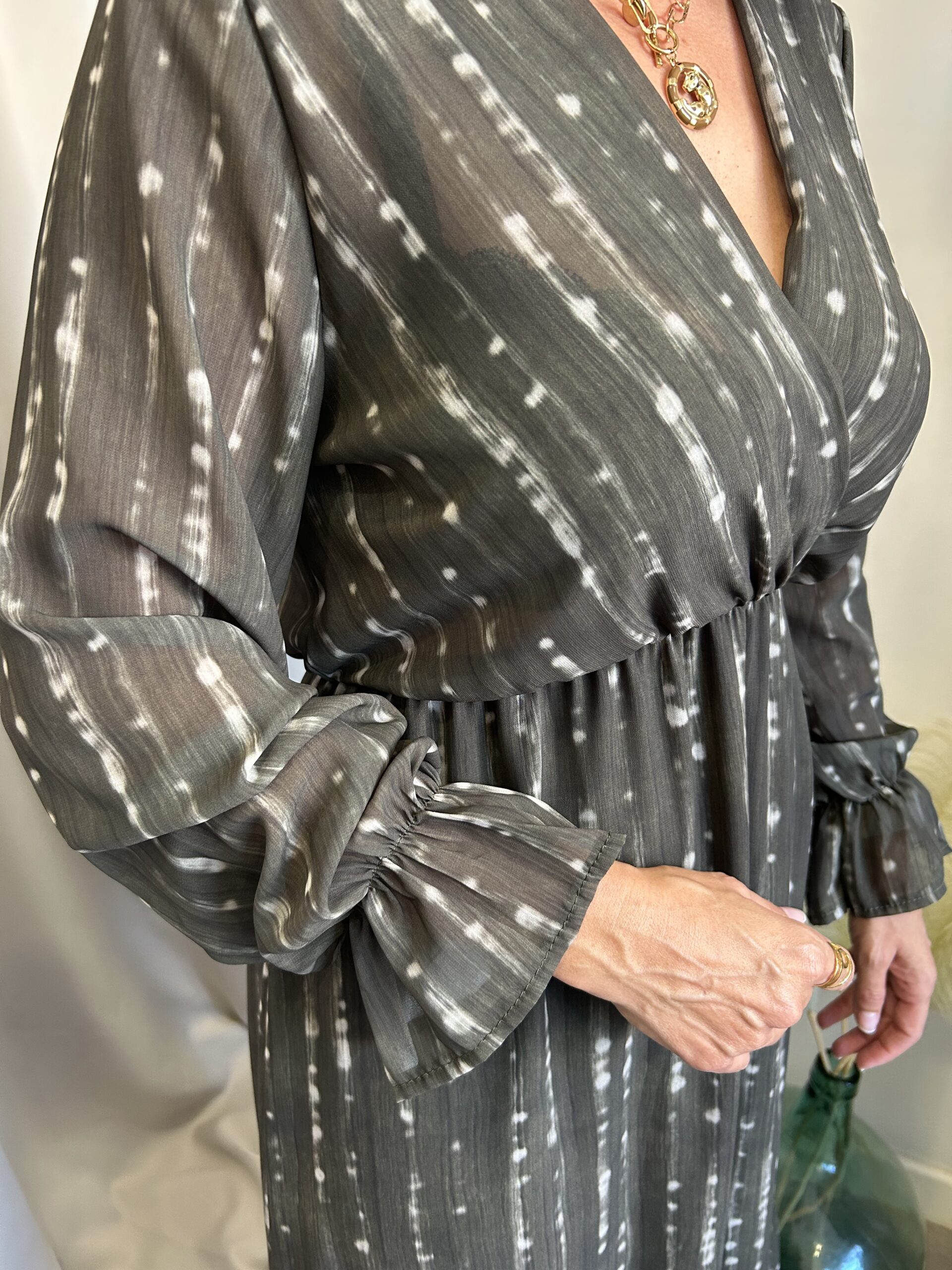 Vestido largo y de manga larga con goma en el puño. Escote cruzado y goma ajustable debajo del pecho. Forro interior. Tejido efecto gasa. Talla única (desde la 36 hasta la 42).