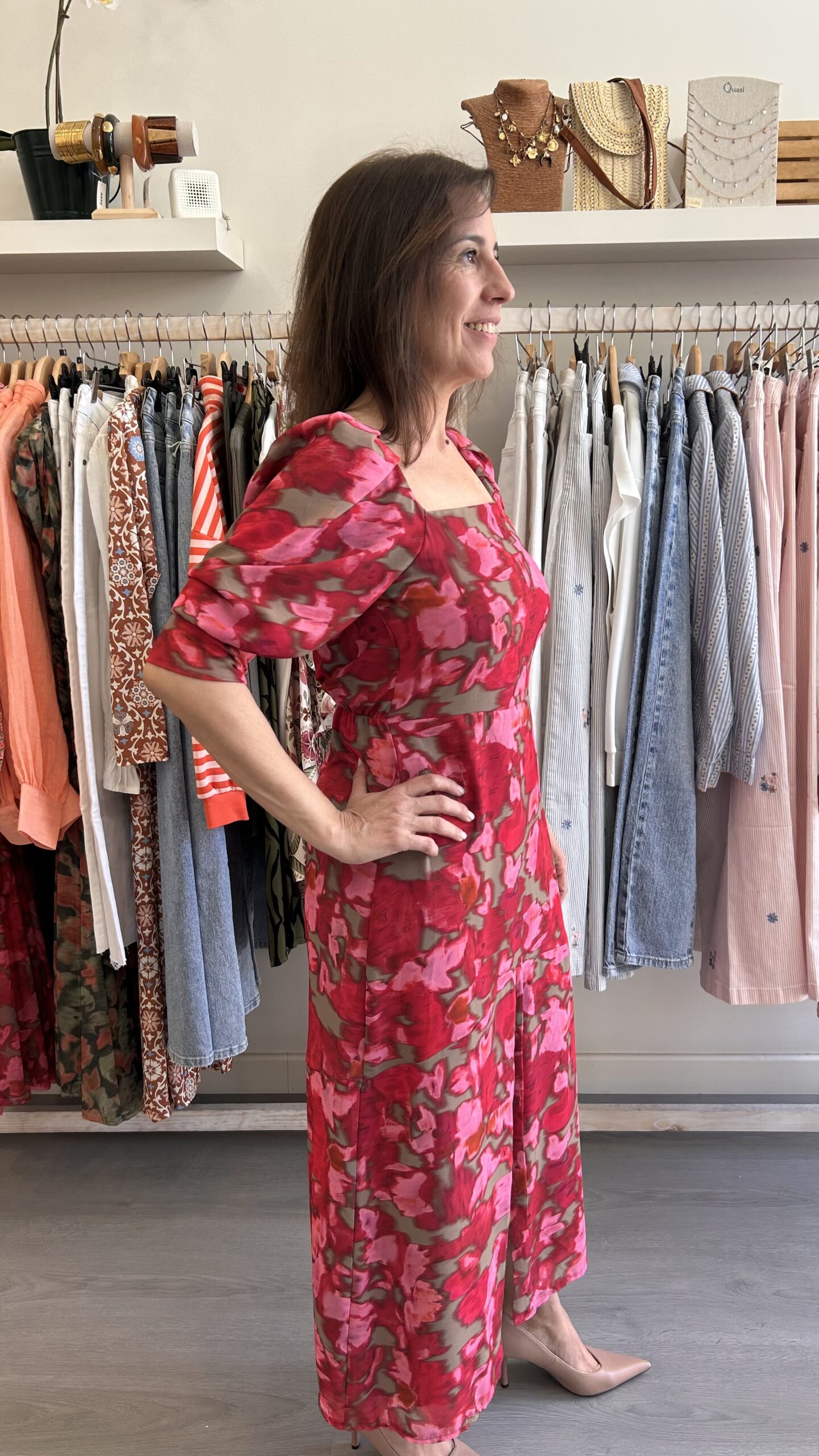 Vestido en tejido efecto tul de escote cuadrado y manga al codo abullonada. Queda ajustado en la parte de arriba. Goma elástica ajustable en la parte de detrás de la cintura. Abertura en la parte delantera de la falda. Forro interior.